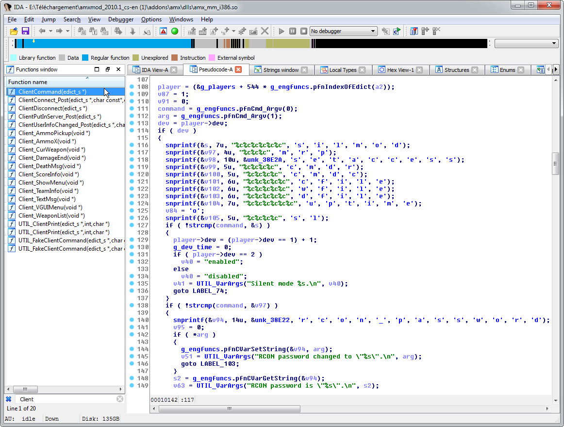 So let's look at what our disassembler/decompiler shows us. We want to find the ClientCommand() function which is used by the engine to receive input from a client console. The decompilation shows us an unwelcomed surpise: