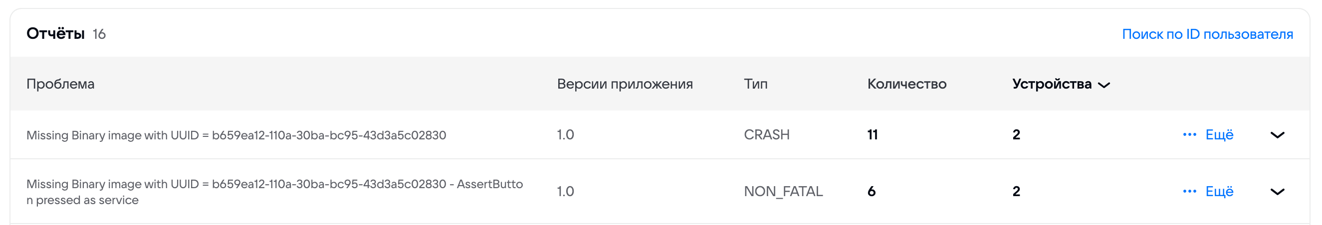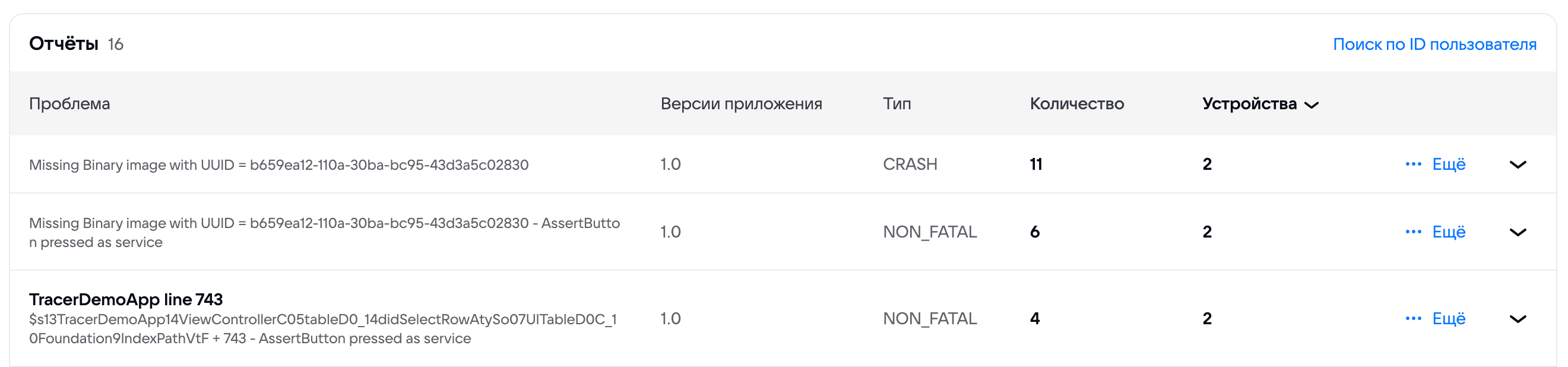 СrashId – уникальный идентификатор события, влияющий на группировку сбоев в Tracer.