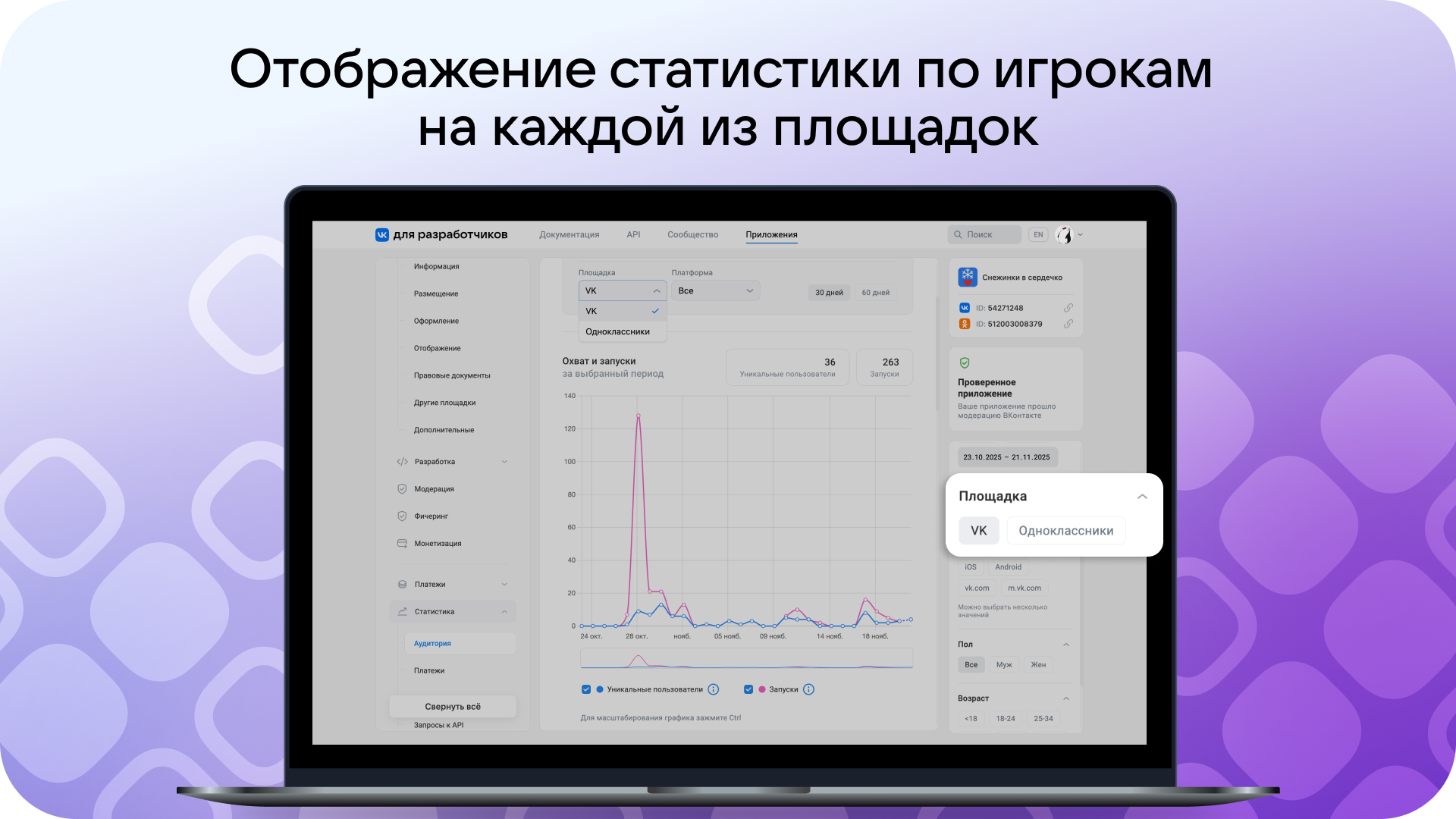 Дистрибуция игр выходит на новый уровень: с 26 ноября 2025 вы можете публиковать проекты одновременно ВКонтакте и Одноклассниках и управлять ими из административной панели на dev.vk.com. Мы объединили все процессы: создание, изменение, статистику, монетизацию, модерацию и поддержку — всё это доступно в одном окне для разработчиков.