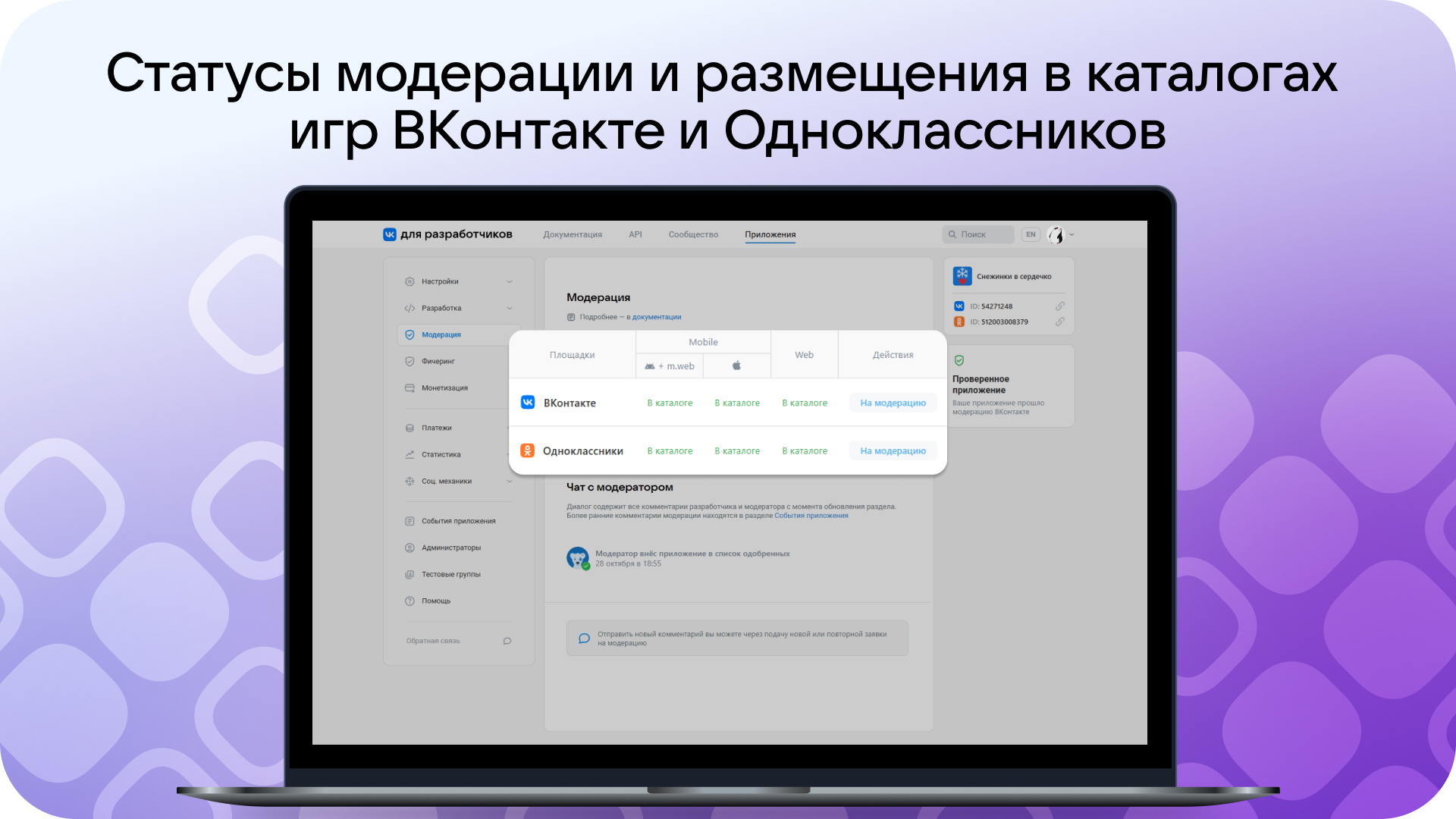 Запустите игру в каталогах ВКонтакте и Одноклассниках одновременно: в разделе «Модерация» укажите платформы, которые поддерживает проект — Mobile, Web или обе — и отправьте заявку на публикацию в игровых каталогах соцсетей. Процесс и интерфейс взаимодействия разработчика с модератором — едины для обеих площадок. Как попасть в каталог — читайте в документации