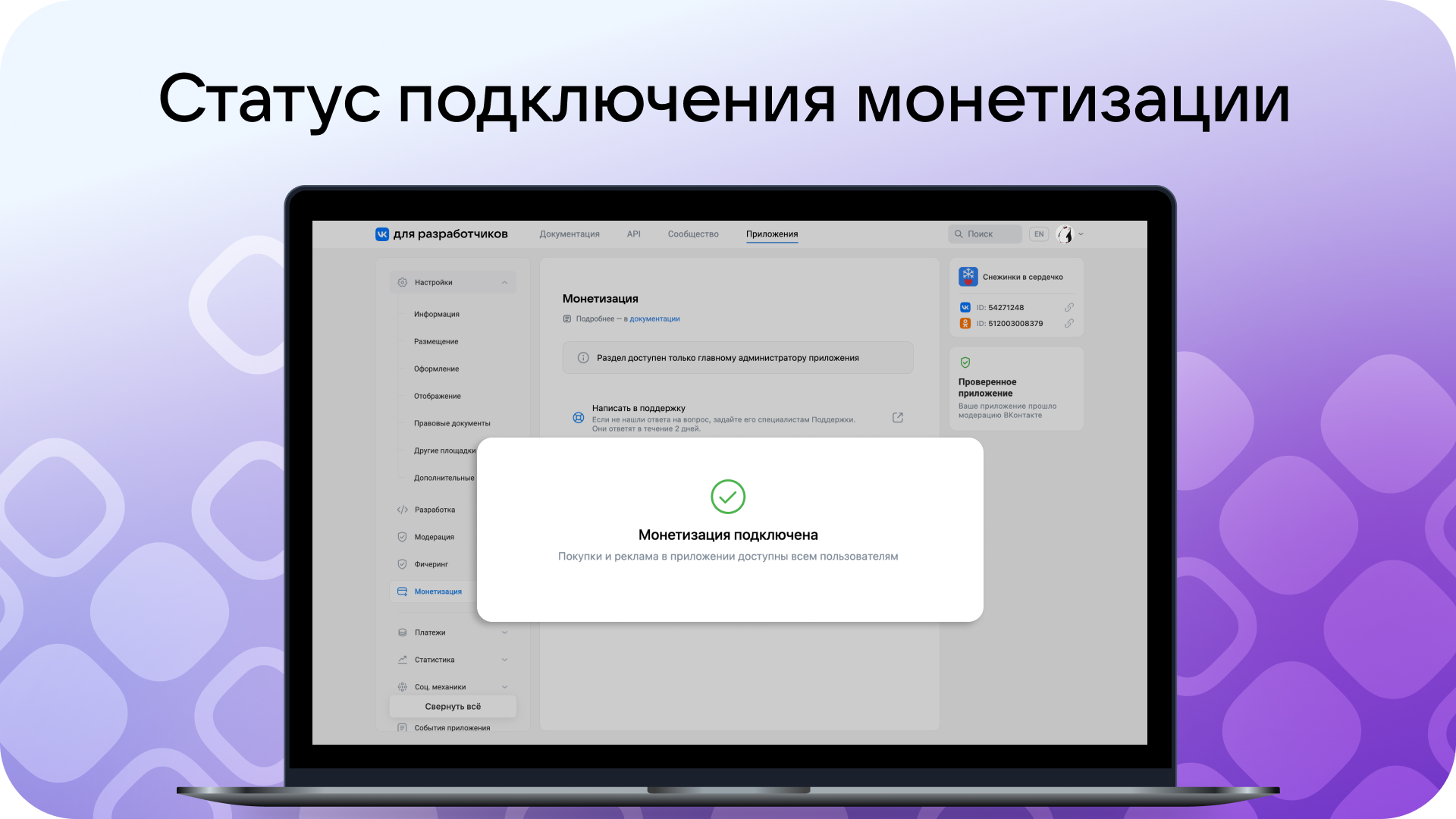 Выводите заработок от рекламы и продажи виртуальных товаров со всех площадок через единый Кабинет выплат. Зарегистрируйтесь в Кабинете выплат, подключите в нём вашу игру и пройдите модерацию. Тогда вы сможете выводить заработанные средства со всех платформ и площадок. Как подключить монетизацию — рассказали в документации.