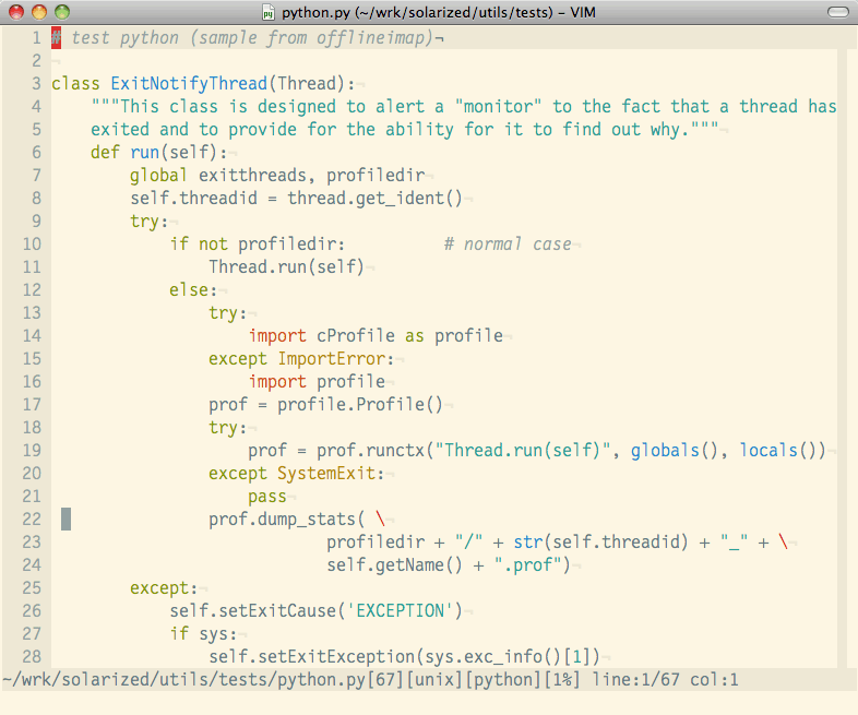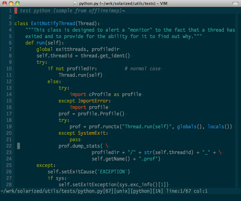 Solarized is a sixteen color palette (eight monotones, eight accent colors) designed for use with terminal and gui applications. It has several unique properties. I designed this colorscheme with both precise CIELAB lightness relationships and a refined set of hues based on fixed color wheel relationships. It has been tested extensively in real world use on color calibrated displays (as well as uncalibrated/intentionally miscalibrated displays) and in a variety of lighting conditions.
