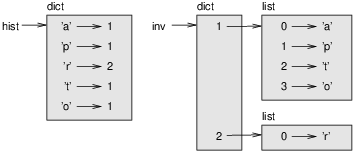 Each time through the loop, key gets a key from d and val gets the corresponding value. If val is not in inverse, that means we haven’t seen it before, so we create a new item and initialize it with a singleton (a list that contains a single element). Otherwise we have seen this value before, so we append the corresponding key to the list. Here is an example: >>> hist = histogram('parrot')