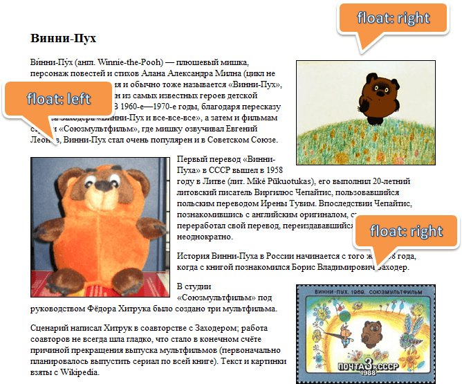 Например, вот страница о Винни-Пухе с картинками, которым поставлено свойство float: