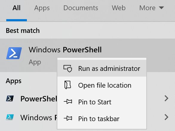 powershell, right click on it and select Run as administrator. You will be prompted for permissions, click "Yes".