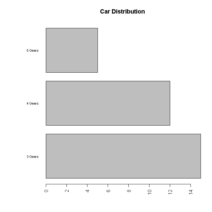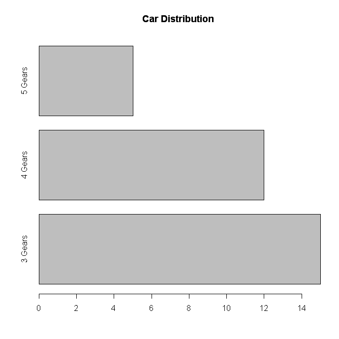barplot(counts, main="Car Distribution", horiz=TRUE, names.arg=c("3 Gears", "4 Gears", "5 Gears"), cex.names=0.8)