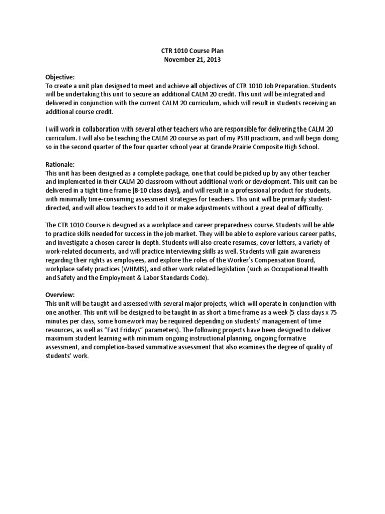 all objectives of CTR 1010 Job Preparation. Students will be undertaking this unit to secure an additional CALM 20 credit. This unit will be integrated and delivered in conjunction with the current CALM 20 curriculum, which will result in students receiving an additional course credit. I will work in collaboration with several other teachers who are responsible for delivering the CALM 20 curriculum. I will also be teaching the CALM 20 course as part of my PSIII practicum, and will begin doing so in the second quarter of the four quarter school year at Grande Prairie Composite High School. Rationale: This unit has been designed as a complete package, one that could be picked up by any other teacher and implemented in their CALM 20 classroom without additional work or development. This unit can be delivered in a tight time frame (8-10 class days), and will result in a professional product for students, with minimally time-consuming assessment strategies for teachers. This unit will be primarily studentdirected, and will allow teachers to add to it or make adjustments without a great deal of difficulty. The CTR 1010 Course is designed as a workplace and career preparedness course. Students will be able to practice skills needed for success in the job market. They will be able to explore various career paths, and investigate a chosen career in depth. Students will also create resumes, cover letters, a variety of work-related documents, and will practice interviewing skills as well. Students will gain awareness regarding their rights as employees, and explore the roles of the Workers Compensation Board, workplace safety practices (WHMIS), and other work related legislation (such as Occupational Health and Safety and the Employment & Labor Standards Code). Overview: This unit will be taught and assessed with several major projects, which will operate in conjunction with one another. This unit will be designed to be taught in as short a time frame as a week (5 class days x 75 minutes per class, some homework may be required depending on students management of time resources, as well as Fast Fridays parameters). The following projects have been designed to deliver maximum student learning with minimum ongoing instructional planning, ongoing formative assessment, and completion-based summative assessment that also examines the degree of quality of students work.