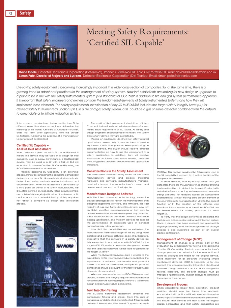 David Riddle, Detector Electronics Corporation (Det-Tronics), Phone: +1-800-765-FIRE Fax: +1-952-829-8750 Email: [Link]@[Link] Simon Pate, Director of Projects and Systems, Detector Electronics Corporation (Det-Tronics), Email: [Link]@[Link] Life-saving safety equipment is becoming increasingly important in a wider cross-section of companies. So, at the same time, there is a growing trend to adopt best practices for the management of safety systems. Now industrial clients are looking for new design or upgrades to a plant to be in line with the Safety Instrumented System (SIS) standards of IEC61508* in addition to fire and gas system performance approvals. It is important that safety engineers and owners consider the fundamental elements of Safety Instrumented Systems and how they will implement these elements. The safety requirements specification of any SIS to IEC61508 includes the target Safety Integrity Level (SIL) for defined Safety Instrumented Functions (SIF). In a fire and gas safety system, a SIF could be a gas or flame detector combined with the outputs to annunciate or to initiate mitigation systems.