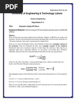 h=filter(b,a,x); stem(n*T,h); xlabel('time in seconds');ylabel('ha(t) '); Specification: 38. Filter Type: Low Pass Digital(ButterWorth) Using Billinear Transformation,T=2. 39. PassBand Frequency(Wp) = 0.4*pi. 40. StopBand Frequency(Ws) = 0.6*pi. 41. Passband Ripple= 0.5. 42. Stopband Attunation=50. Wp=0.4*pi ; Ws=0.6*pi ; Rp=0.5;As=50; T=2; OmegaP = (2/T)*tan(Wp/2); OmegaS = (2/T)*tan(Ws/2); [cs,ds] = LP_butterworth (OmegaP,OmegaS,Rp,As); [b,a] = bilinear(cs,ds,1/T); [db,mag,pha,grd,w] = freqz_m(b,a); subplot(2,1,1);plot(w/pi,db);grid on; xlabel('Frequency in Hz');ylabel('Decibel'); title('Digital Low Pass Butterworth filter,Billinear Transformation,T=2'); Nmax=100;t=0:T/10:T*Nmax; [ha,x,t]=impulse(cs,ds,t); subplot(2,1,2);plot(t,ha);grid on; xlabel('time in seconds');ylabel('ha(t) '); title('Impulse Response'); [x,n]=impseq(0,0,Nmax);h=filter(b,a,x); stem(n*T,h);grid on;