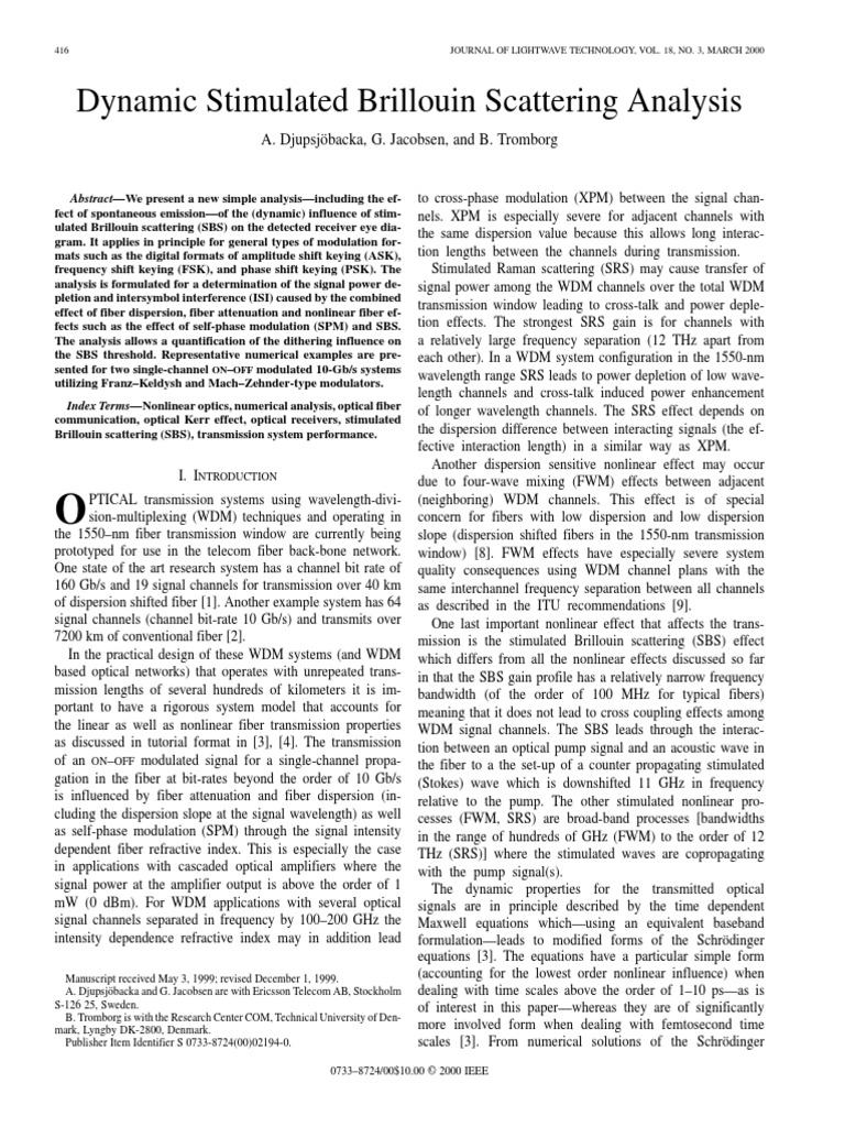 Dynamic Stimulated Brillouin Scattering Analysis: A. Djupsjöbacka, G. Jacobsen, and B. Tromborg