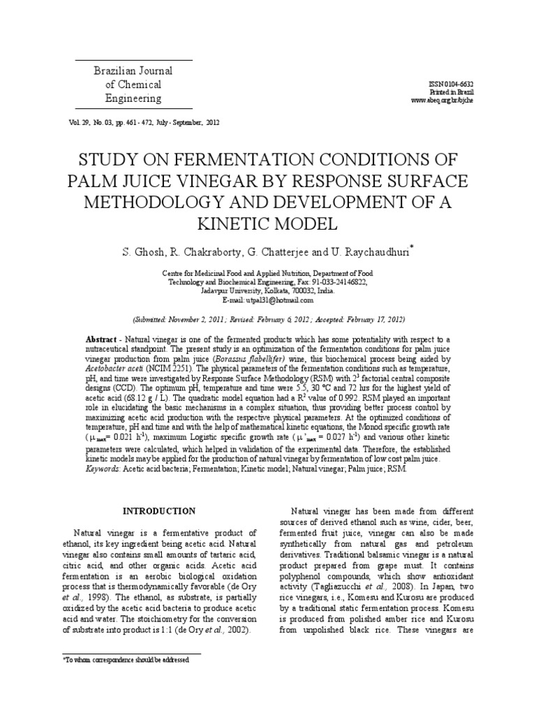 Keywords: Acetic acid bacteria; Fermentation; Kinetic model; Natural vinegar; Palm juice; RSM.