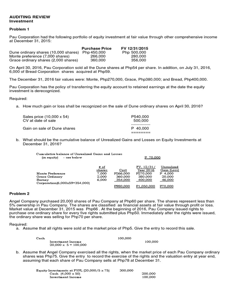 On April 30, 2016, Pau Corporation sold all the Dune shares at Php54 per share. In addition, on July 31, 2016,