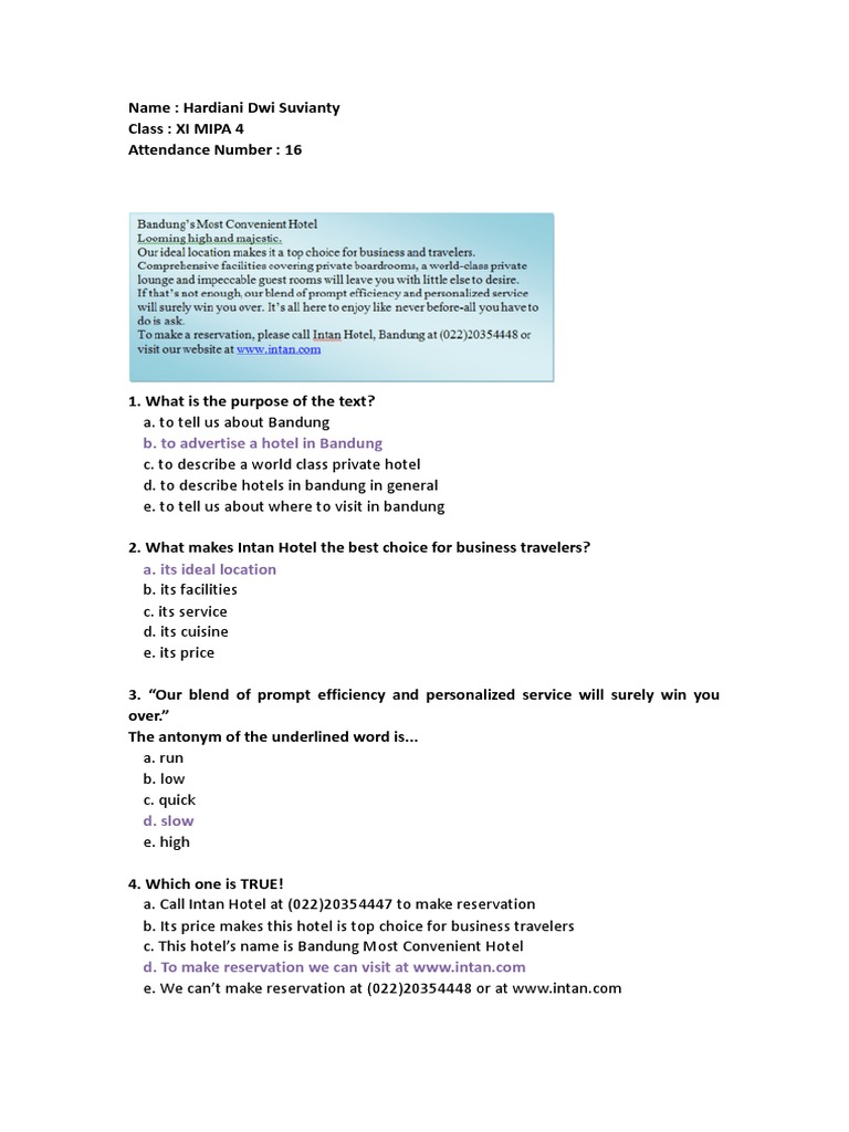 a. Call Intan Hotel at (022)20354447 to make reservation