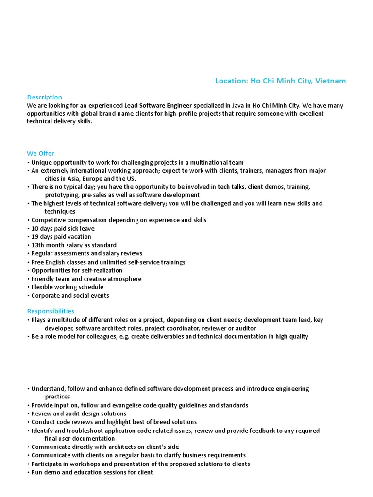 We are looking for an experienced Lead Software Engineer specialized in Java in Ho Chi Minh City. We have many
