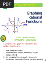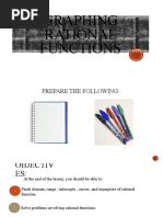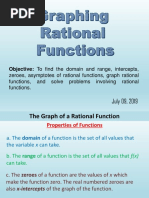 The document provides information about rational functions including their definition, domain, vertical and horizontal asymptotes, and intercepts. It also provides examples and instructions for graphing rational functions by finding these key features algebraically first before sketching. Some key points are that the domain excludes values that make the denominator equal to 0, vertical asymptotes occur at values that make the denominator but not numerator equal to 0, and horizontal asymptotes depend on the relative degrees of the numerator and denominator polynomials.