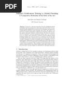 the target program P n times, transforms this unrolled program into the SAT formula P , and then checks whether P can reach an error within this bound n by checking the satisfiability of P [33]. In spite of the NP-complete complexity, structured Boolean satisfiability (SAT) formulas generated from real-world problems are successfully solved by SAT solvers in many cases. Modern SAT solvers exploit various heuristics [53] and can solve some large SAT formulas containing millions of variables and clauses in modest time [4]. To use a SAT solver as a bounded model checker to verify whether a given C program P satisfies a requirement property R, it is necessary to translate both P and R into Boolean formulas P and R , respectively. A SAT solver then determines whether P ^ :R is satisfiable: If the formula is satisfiable, it means that P violates R; if not, P satisfies R (note that each satisfying assignment to P represents a possible execution trace in P ). A brief sketch of the translation process follows [19]. We assume that a given C program is already preprocessed. First, the C program is transformed into a canonical form, containing only if, goto, and while statements without side effect statements such as ++. Then, the loop statements are unwound. The while loops are unwound using the following transformation n times: whilee stm ) ife fstm; whilee stmg After unwinding the loop n times, the remaining while loop is replaced by an unwinding assertion assert(!e) that guarantees that the program does not execute more iterations. A similar procedure is applied to loops containing the backward goto statements. If the unwinding assertion is violated, n is increased until the unwinding bound is sufficiently large. Note that this bound n is only an upper bound of the loop iteration and does not need to be the exact number of iterations. Finally, the transformed C program consists of only nested if, assignments, assertions, labels, and forward goto statements. This C program is transformed into static single assignment (SSA) form. Fig. 4b illustrates the SSA form of the C program in Fig. 4a. This SSA program is converted into corresponding bit-vector equations through combinatorial circuit encoding and the final Boolean