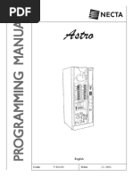 This document provides instructions for accessing and navigating the programming menus on a Necta vending machine. The machine has three operating modes that can be accessed by pressing the programming button: normal vending mode, filler menu, and technician menu. The filler menu contains options for printing, displaying, and resetting statistics related to item sales, prices, discounts, coin processing, and other machine operations. Navigation buttons are used to move between menu items and levels in the programming interface.