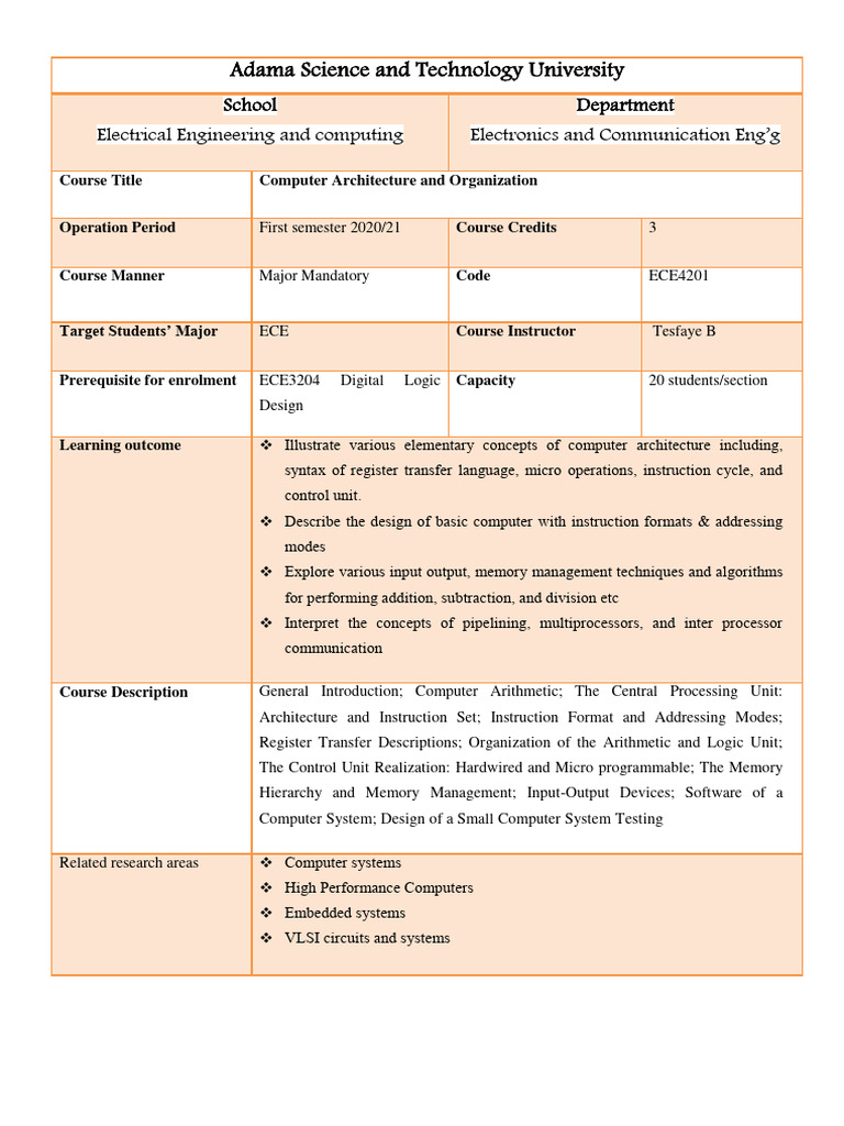 Target Students’ Major ECE Course Instructor Tesfaye B