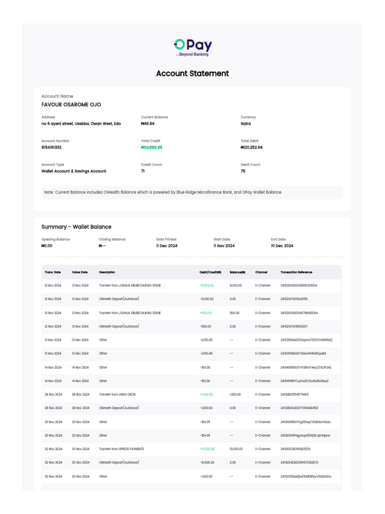 30 Nov 2024 30 Nov 2024 OPay Card Payment -3,000.00 95.51 POS 241130330100200175157294
