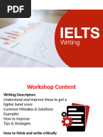 DOs and DON'Ts Make sure that you read all of the information in the questions very carefully and respond appropriately. Make sure that you follow all instructions including the number of words that you need to write. Make sure that you stop Writing Task 1 after 20 minutes to allow enough time to answer Writing Task 2. Remember that Writing Task 2 carries more marks, so you need plenty of time to answer it. Make sure that, for Task 1, you copy data accurately from the question paper. Make sure that you plan your ideas before you begin to write. For Writing Task 1, stop to locate and select the most important pieces of information. For Writing Task 2, take time to organise your ideas and argument. Be sure to provide supporting evidence for any of your claims or views in Writing Task 2. Leave time to check your answer for careless mistakes at the end. Try to check for spelling mistakes, verb and subject agreement, singular/plural nouns, tense mistakes and problems of fluency. Make sure that all of your ideas are relevant to the question. Try to avoid repeating the same words, phrases and ideas too often. Try to use a range of vocabulary. Try to make sure that you do not repeat the same idea too often, make sure you explore different ideas to provide a well-balanced response. Make sure to write as clearly as possible. Make sure that you produce organised and linked paragraphs and that the tone of your language is academic. Don't copy from other peoples work. Don't write less than the required number of words. Don't repeat task instructions in your writing. Dont use note form or bullet points. Dont leave out any required information. Dont waste your time learning essays by heart to use in the exam. You will be penalised for this and you will waste valuable time that could be spent developing good writing skills.