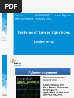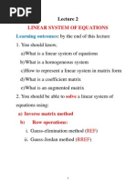 2. Non-homogeneous System of Linear Equations Gauss-Jordan Method Theorem 2.1. If Ax = b is a system of linear equations and [A : b] is the augmented matrix, then the system is consistent i rankA = rank[A : b] If rankA = rank[A : b] =: r and n denotes the number of unknowns, then Case 1: n = r. The system has a unique solution. Case 2: n > r. The system has innite number of solutions. n r of the unknowns can be given arbitrary values. Problem 2.2. Use Gauss-Jordan method to examine the consistency of the following system of linear equations. (4) x1 + x2 + x4 = 3 (5) x2 + x3 = 4 (6) x1 + 2x2 + x3 + x4 = 8 Solution Denote the equations by E1 , E2 , E3 Apply E3 E3 E1 (7) x1 + x2 + x4 (8) x2 + x3 (9) x2 + x3 Here 1.8 and 1.9 contradict each tem is not consistent. = 3 = 4 = 5 other, and hence the sys-
