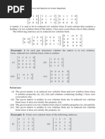 1. Homogeneous System of Linear Equations Problem 1.1. The vector (c1 , c2 , c3 ) is a solution of a11 x1 + a12 x2 + a13 x3 = 0 a21 x1 + a22 x2 + a23 x3 = 0 a31 x1 + a32 x2 + a33 x3 = 0 Show that, for k = 0, (kc1 , kc2 , kc3 ) is also a solution. Since (c1 , c2 , c3 ) is a solution of the system of equations, a11 c1 + a12 c2 + a13 c3 = 0 a21 c1 + a22 c2 + a23 c3 = 0 a31 c1 + a32 c2 + a33 c3 = 0 Multiplying each equation by k, a11 kc1 + a12 kc2 + a13 kc3 = k(a11 c1 + a12 c2 + a13 c3 ) = 0 a21 kc1 + a22 kc2 + a23 kc3 = k(a21 c1 + a22 c2 + a23 c3 ) = 0 a31 kc1 + a32 kc2 + a33 kc3 = k(a31 c1 + a32 c2 + a33 c3 ) = 0 Hence the conclusion. Problem 1.2. Given the system of equations, (1) x + 3y + 2z = 1 (2) 2x + 2y z = 1 (3) x + 4y + 3z = 5 (1) Write down the coecient matrix. (2) Write down the augmented matrix. (3) Transform the augmented matrix to the triangular form. (4) Solve the system of equations.